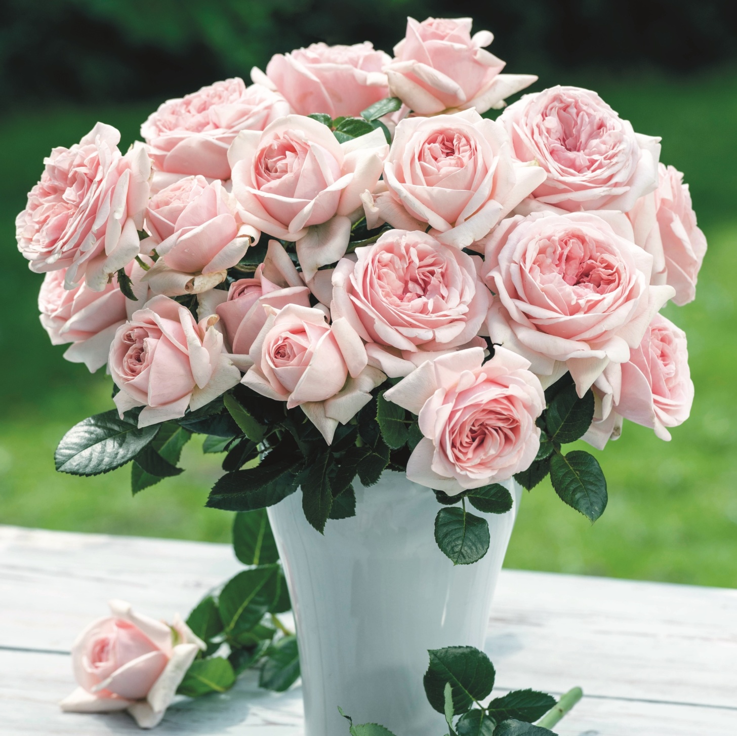 Aphrodite: Nostalgische grootbloemige rozenstruik met zachtroze licht geurende bloemen. Zeer gezonde lang en doorbloeiende struikroos met een groeihoogte van 80-90 cm.